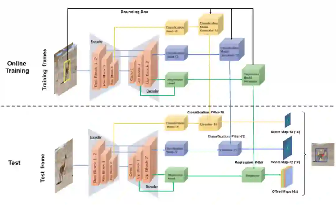 该网络的上半部分为在线训练部分,用来通过训练帧(给定的第一帧以及以及跟踪结束的之前帧)产生分类 model 和回归 model(即卷积核),下半部分为测试部分,通过上面产生的 model 来对当前的测试帧进行分类和回归,得到目标的中心点和中心点到四个边界的偏移,从而产生最终的目标框。