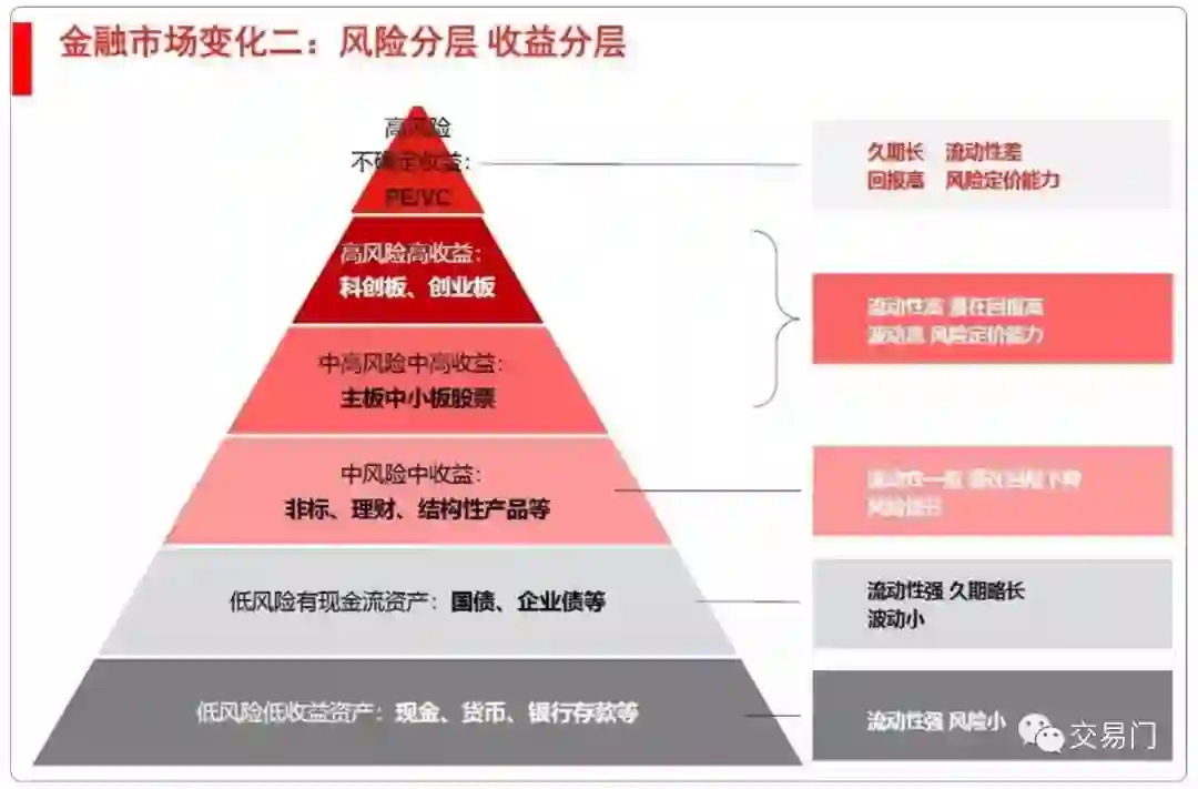 第二个变化,风险和收益的分层。我们已经看到收益率和风险出现了分层,也就是让高收益率对应高风险资产,低收益率对应低风险资产。未来所有资产的风险收益和波动率都要匹配。