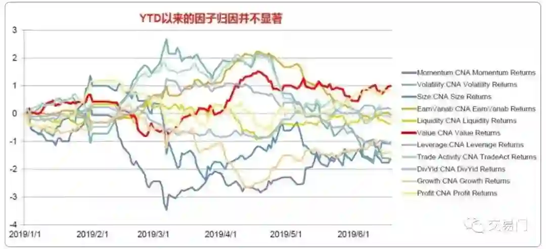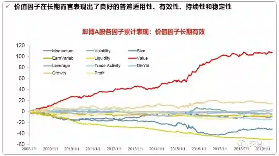 下面这张图显示了从2008年到2019年6月18日,A股各因子的累计表现。红色线表示的是价值因子(Value),显示了很强的收益率,这个收益率主要来自做多低估值股票,做空高估值股票。我们看到价值因子的收益率非常稳定,从2008年至今获得了100%的收益,而且回撤很小。从相对收益的角度看,这个收益率曲线体现了低估值股票在过去10年远远跑赢高估值股票,有很强的相对收益。