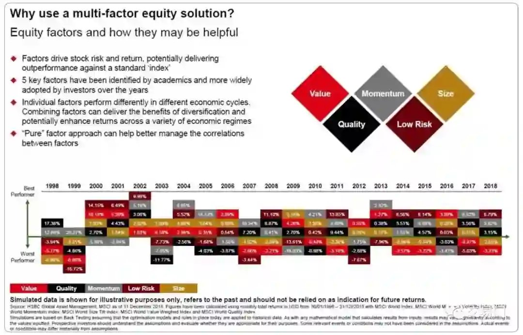 我们对于市场回报率的分析主要基于CAPM模型。经过汇丰集团多年的历史统计,我们发现市场的回报主要由几个因子主导:价值因子、质量因子、动量因子、低风险因子,大小盘因子。