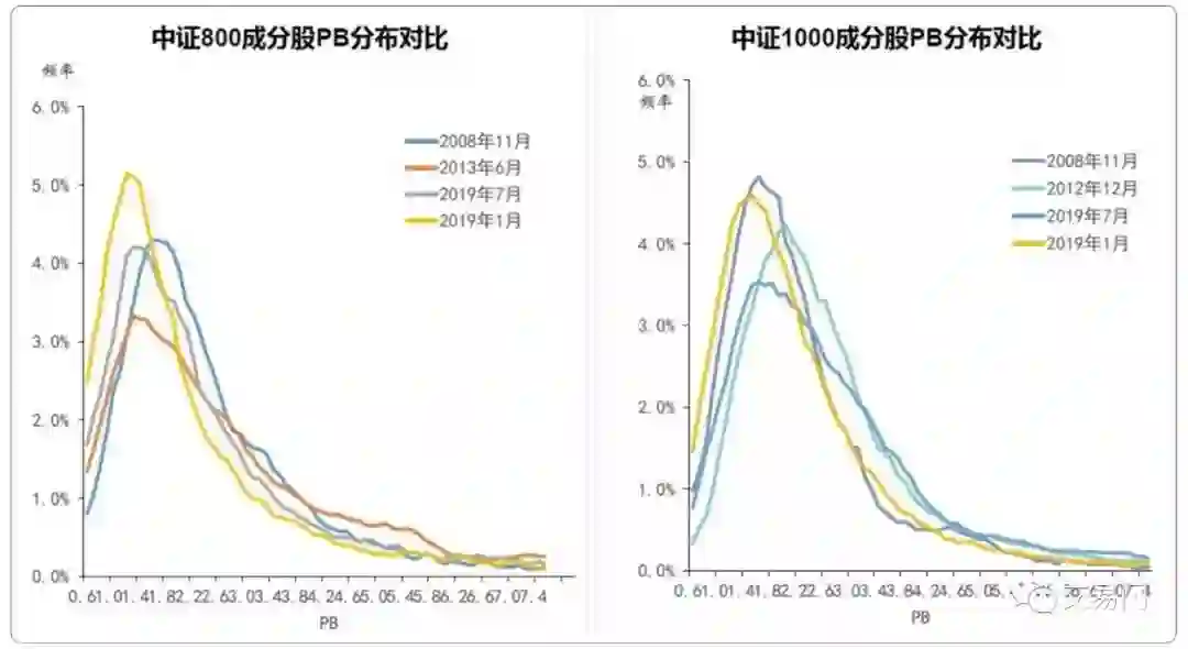 从我们的PB-ROE模型看,股票定价的偏离度在加大。无论是从中证800还是中证1000的成分股来看,PB估值明显是左偏的,PB小于1的股票数量已经很多,而PB高估的股票数量很少。这说明目前阶段大部分股票的估值都比较低。