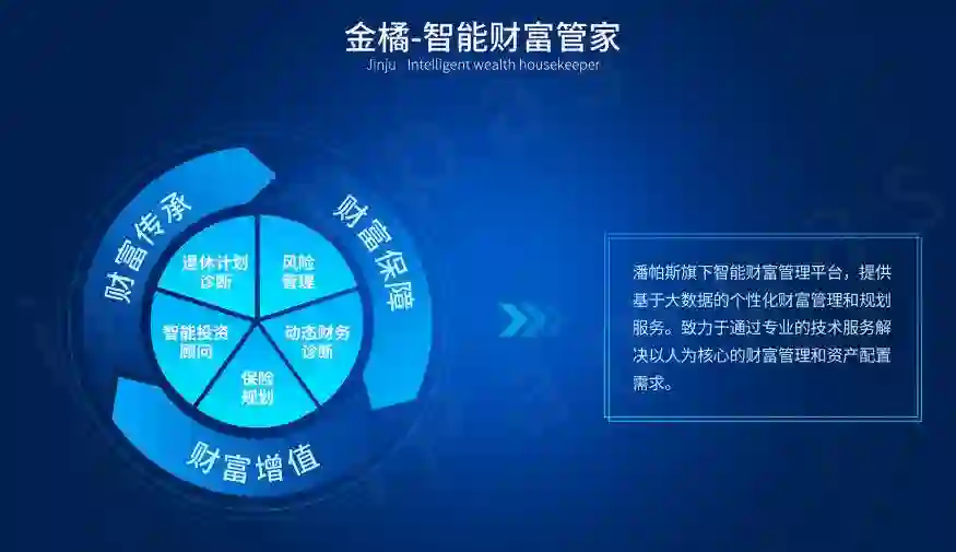 “金橘”定位为智能财富管家,致力于提升B端客户面向C端用户的财富管理服务能力。潘帕斯与各类金融机构合作,结合用户自身在基本信息、收入和财富目标等方面的动态特征,利用大数据和人工智能等技术自动处理和建模分析,对用户进行财富方面的多维度评价,并推荐专业、智能、客观的财富配置方案。