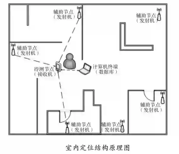 目前的定位技术多要借助辅助节点进行定位, 通过不同的测距方式, 计算出待测节点相对于辅助节点的位置,然后与数据库中事先收集的数据进行比对, 从而确定当前位置,如图所示。