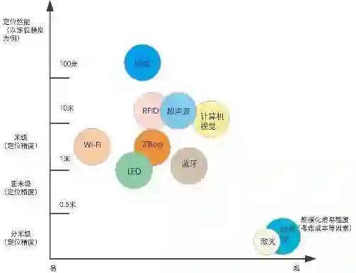 下图是各种室内定位方案的对比图: