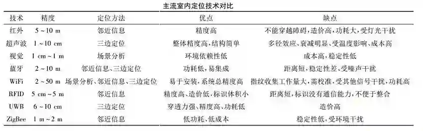 在精度、定位方法、实例和优缺点等方面对当前比较成熟的几种室内定位技术进行对比,从宏观上掌握室内定位技术领域发展的方向和目前研究的瓶颈问题。