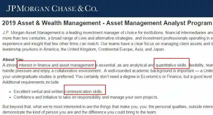 摩根大通的招聘描述中提到,希望求职者有金融专业背景,或者至少对金融和资产管理感兴趣。CFA证书也是一些顶级资管公司的敲门砖。