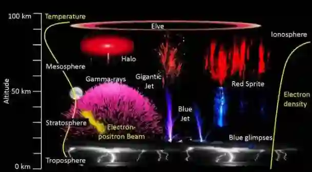 其中,“精灵”(Sprites)是中间层被击穿造成的闪光。“蓝色喷流”是通过平流层向上的放电。“淘气精灵”(elves, abbr. Emissions of Light and Very Low Frequency Perturbations from Electromagnetic Pulse Sources,电磁脉冲源造成的甚低频扰动与发光现象,由氮气分子激发造成)则是从电离层底部边缘的电磁脉冲引发的向外发散的同心环。“巨人”(Giants)是从雷暴顶部到电离层底部的大型击穿放电现象。地球伽马射线闪(terrestrial Gamma Ray Flashes,TGFs)是一种在雷暴顶部产生的闪光现象。已有证据表明,这些现象中一些是由逃逸的电子放电造成。