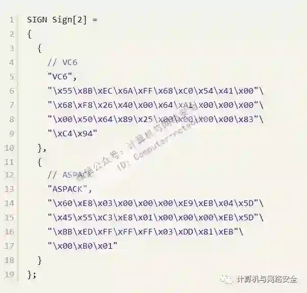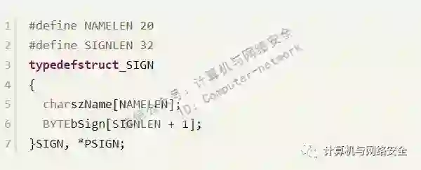 有了这些特征码,就可以开始编程了。先来定义一个数据结构,用来保存特征码,该结构如下: