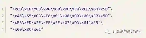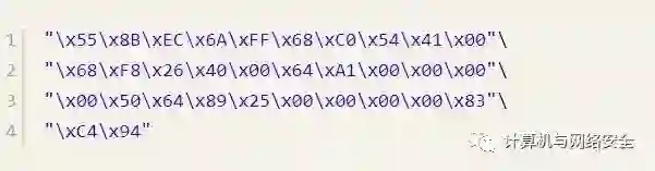 可以看到这就是未加壳程序的入口处代码,在图4中,“十六进制”列中就是代码对应的十六进制编码,我们就是要提取这些十六进制编码。提取结果如下: