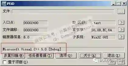 壳的识别是通过特征码来进行的,特征码的提取通常是选择文件的入口处。壳会修改程序的入口处,因此对于壳的特征码来说选择入口处比较合适。我们的工具主要是用来学习和演示用的,因此写的查壳工具要能识别两种类型,第一种类型是可以识别用Visual C++6.0编译出来的文件,第二种类型就是可以识别ASPack加壳后的程序,当然ASPack加壳工具的版本众多,这里只要能识别上面演示的那个版本的ASPack就可以了。