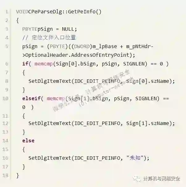 提取了特征码,对于查壳工作就剩特征码匹配了,这个非常简单,只要用文件的入口处代码和特征码进行匹配,匹配相同就会给出相应的信息。查壳的代码如下: