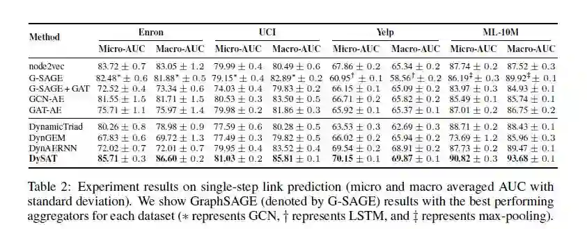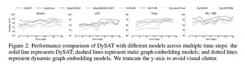我们通过每个t = 1,...,T的模型在t + 1进行评估,表2展示了所有模型在整个时间步长上的性能表现,与所有模型中的最佳基准相比,DySAT获得了最好的效果。