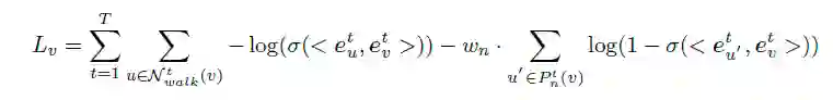 为了确定学习到的节点表示捕获了结构与时间信息,我们定义了保存了不同时间图上节点周围的局部结构目标函数。在每一个时间步使用一个二元交叉熵损失函数,去鼓励在固定长度的随机游动中同时出现的节点具有相似的表示形式.。