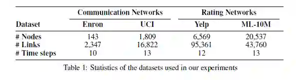 我们使用四个动态图数据集验证DySAT的有效性,在每个数据集中,根据在固定长度的时间中观察到的交互,创建多个图快照。数据集统计数据如表1所示: