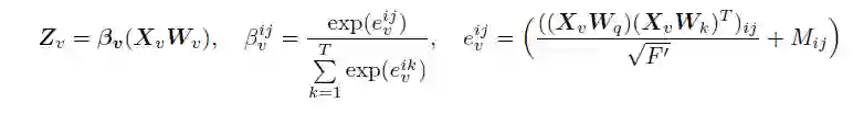 M∈ R^{T*T}是一个mask矩阵,每一项M_ij∈ {-∞,0},当M_ij=-∞时,softmax函数的结果为0即β^{ij}_v=0。