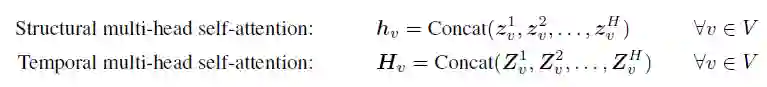 DySAT将T个图快照的集合作为输入,并输出每个时间步生成的潜在节点表示。主要由两个组件组成:结构和时间自注意力层,可通过堆叠多层来构造任意图神经体系结构。并且我们采用多头( multi-head)注意力来提高模型的能力和稳定性。