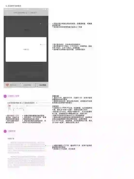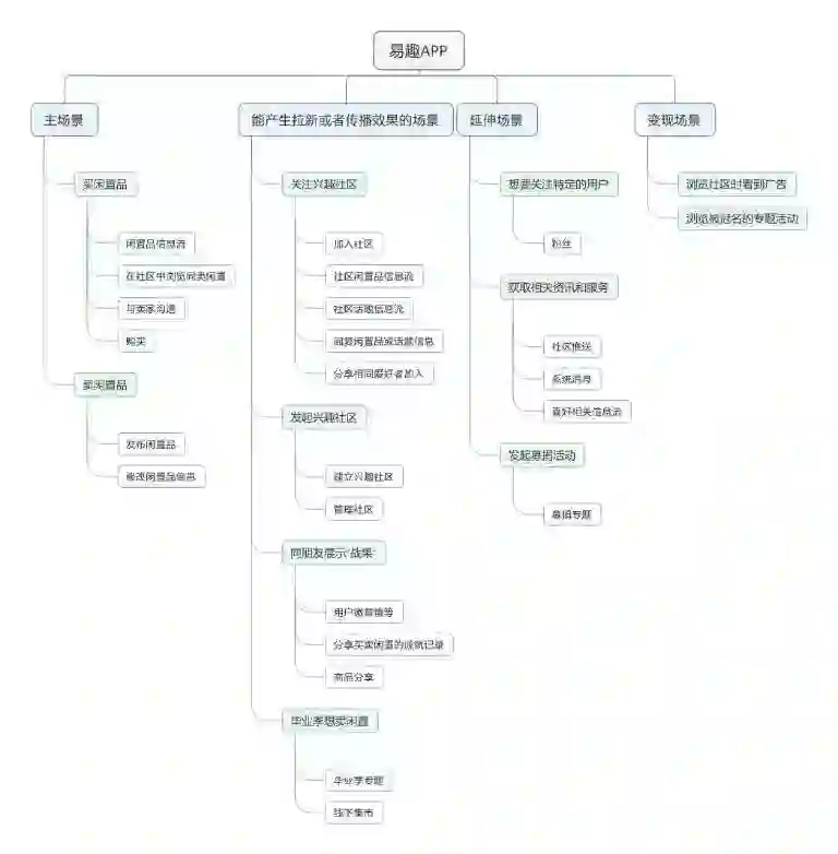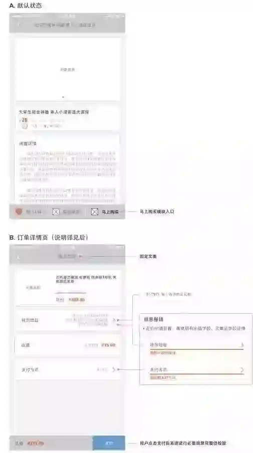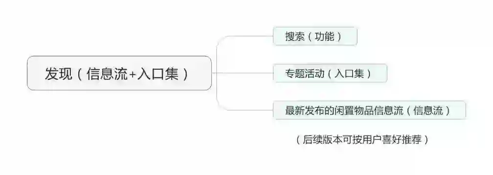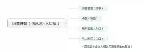 1. 展示闲置详情——闲置信息(信息) 2. 表达支持态度或想收藏闲置物品——点赞(功能) 3. 想直接与卖家沟通闲置细节——联系卖家(入口) 4. 决定购买这件闲置物品——马上购买(入口) 5. 想比较类似的闲置物品,再做决定(后续版本加入)——相关闲置推荐(信息流) |