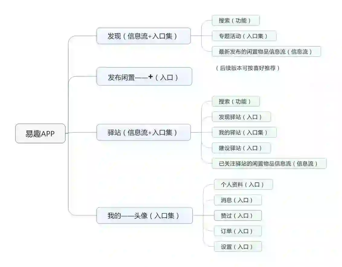 下图为易趣基础构架图。底部主导航围绕买卖闲置的主场景和重要传播场景展开:“发现”和“+”,分别对应“买闲置品”和“卖闲置品”两个场景;“驿站”对应关注、发起兴趣社区等场景。“我的”以头像形式固定在页面左上角,点击可弹出与用户相关的多个功能入口。