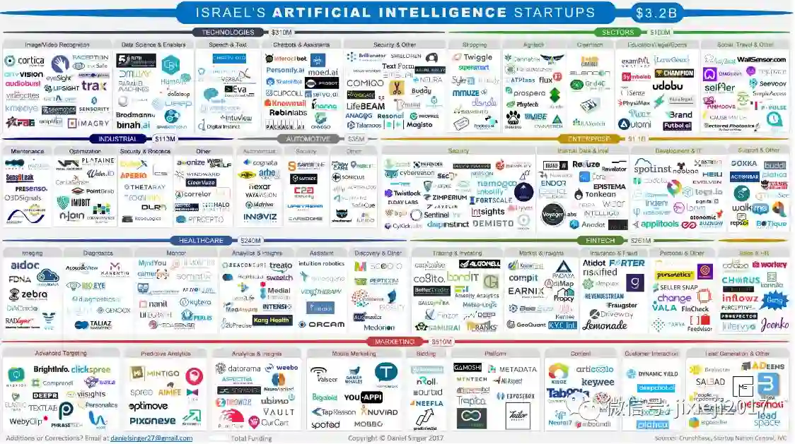 为了了解以色列人工智能的现状,来自以色列的天使投资人 Daniel Singer研究并分析了,以色列所有使用人工智能技术的初创公司。上面的汇总图显示了早期到后期,430家使用人工智能技术作为其核心的以色列初创公司。