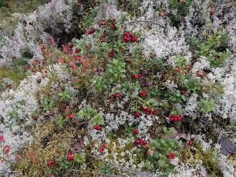 ▲丰富的苔藓与浆果交织成五彩斑斓的郊野地毯。白色苔藓是驯鹿冬季的生命食材,其根系十分脆弱。芬兰人从不会踩踏此类植被
