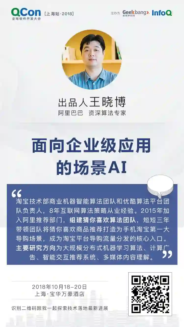 这里介绍一下阿里巴巴资深算法专家王晓博,他将在 QCon 上海 2018 负责出品《企业级应用的场景 AI》专题,与我们一起关注 AI 在业务场景中的应用价值。