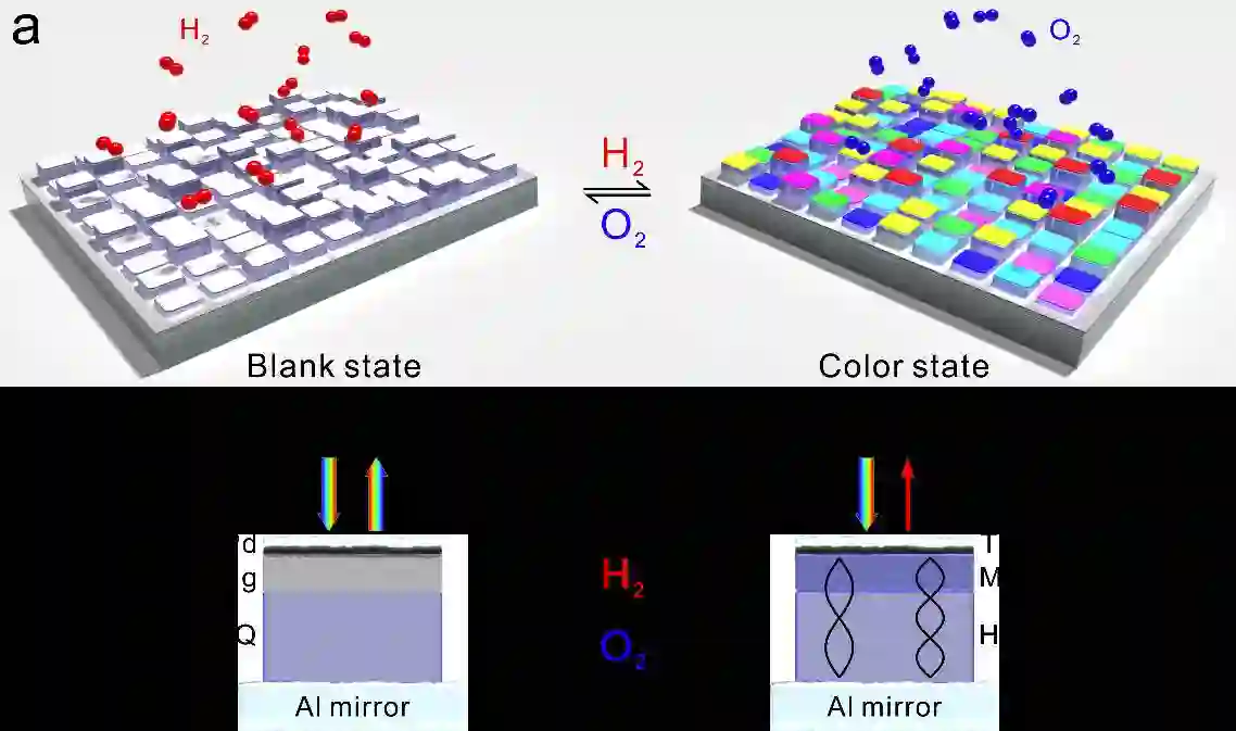 基于衍射、干涉或散射的结构色无油墨彩色打印技术在高分辨彩色显示、滤色器、高密度光学数据存储、商业化的防伪及数据加密中有着重要的应用。相比于传统的油墨染料打印,结构色拥有高分辨、环境友好、不易褪色等优点。在结构色的设计方案中,基于等离激元纳米结构的高分辨彩色打印是近些年来结构色的主要研究方向。等离激元彩色打印以不同大小和形状的金属纳米结构为像素单元,利用金属内部的等离激元共振可选择性地增强光的散射和吸收,从而实现颜色的产生。基于此原理,2012年,湖南大学段辉高及新加坡科技局Joel Yang等人通过金/银纳米结构首次实现了10万dpi的高分辨无油膜的全彩打印,但贵金属的使用限制了其广泛的应用。为了克服此困难,2015年,新加坡科技局Joel Yang等科研人员将低成本、化学性质稳定的金属铝应用到等离激元高分辨彩色打印中,清晰地微缩重构出莫奈的名画《日出·印象》。基于金属铝的等离激元彩色打印提供了一种更为实用化的无油膜彩色打印的方案,然而在实际应用中动态的像素可携带更多的信息,因而具有更广泛的应用前景。在此背景下,2017年初,德国马普智能系统研究所的Na Liu研究团队运用智能金属材料镁的催化氢化及脱氢反应实现了等离激元结构色的动态调控。这种设计不仅具有极高分辨率,同时还可以应用于高密度信息存储。但是,这种基于镁的等离激元结构色存在色彩饱和度差、色域窄等不足,限制了其高端应用。
