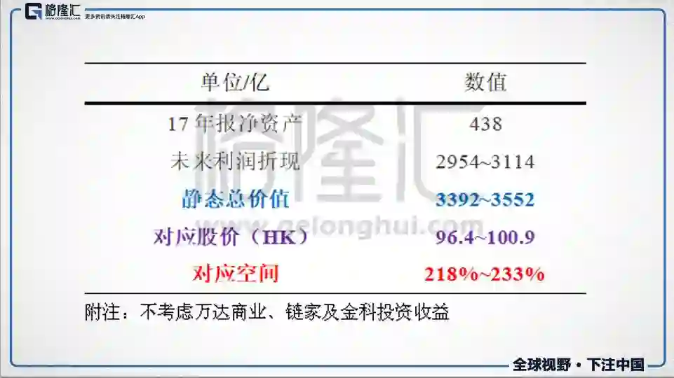 不考虑万达商业、链家以及金科投资收益(未来3~5年收益可能有3~400亿),假设融创不再拿地静态来看,并且不考虑分红,总价值为3270亿(考虑房价上涨则为3411亿,港币兑人民币汇率为0.80),假设未来股本不变,对应股价为:96.4~100.9元港币,对应目标价空间(基于股价3月29日收盘价30.3港元):218%~233%。