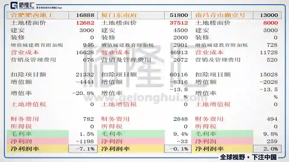 将融创这些数据当做单个项目数据如上表所示便可计算得出利润率,融创部分利润率为15.2%,万达文旅部分为24.4%。这个利润率在地产行业中是十分优秀的。融创总计有300多个项目,其中盈利能力差或可能亏损的整理出来大概有十几个,本文挑其中三个典型来分析这些项目盈利情况。合肥肥西亏损7.1%(已开),厦门东南府开盘卖51800元才不亏钱(据已有样板间建安装修档次),南昌青山湖微利2%(已开)。这些项目不赚钱很简单:拿地太贵。对于房企来说,拿地价格及能力是关乎企业生命。