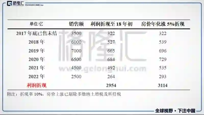 融创2017年年底已售未结大概3500亿将在2018年及以后结转,这3500亿是包含在总货值里的,也就是未售货值大概2.65万亿。假设融创未来不再拿地,将3万亿货值做一个未来五年售出模型如下表所示。2021年和22年销售大降主要因为剩下的为一二级联动以及文旅项目(开发周期较长),将每一年净利润折现至2018年初,折现率为10%,计算结果如下表所示: