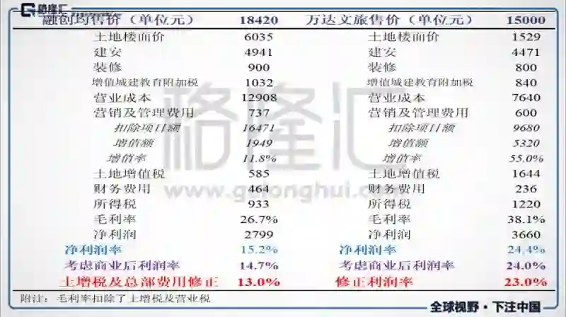 将十个档次项目比例按接近正态分布权重(及利润率越靠近着平均值附近的项目权重越高,并考虑融创实际情况,暴利项目权重明显高于微利或亏损项目),取亏损项目比例为3%,计算结果表明对利润率影响在0.47%,本文认为这个模型下融创真实项目分布情况最为接近。而在亏损项目比例达到15%和20%极端情况下,对利润率影响也只有0.89%和1.11%。作者经过谨慎的多组计算与验证,按单项目平均售价及楼面价计算利润率对结果影响保守估计不超过0.69%。对于十三个万达文旅项目而言,都是高利润项目,土增税在同一档次不需要修正。