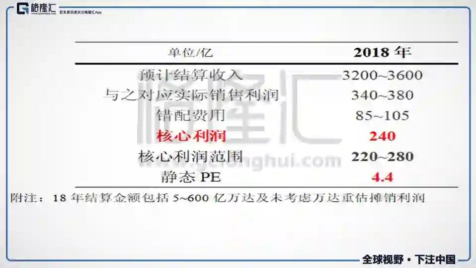 本文已计算出融创实际销售利润率,再推算出年报将要结算的销售额,将错配费用扣除,便可得到年报的核心利润(扣非净利润)。17年年报融创已售未结3500亿;预计18年年报结算收入为3200~3600亿。这部分销售额实际销售利润估计为360亿左右。错配费用分两块,一块为实际销售收入与结算收入(6000亿-3620亿)分别对应的管理营销费错配;一块为实际销售收入与结转收入分别对应的财务费用错配。房企每年会将一定比例的财务费用资本化,费用化的部分会有错配,融创财务费用资本化率大概在50%上下。18年报表核心利润计算如下: