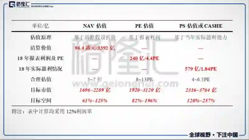 前文在推算融创利润率的过程中对各项费用取值都较保守,实际情况12%~14利润率都有可能,本文在利润率分别为保守、中性、乐观三种情况下计算了静态总估值如下表所示: