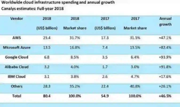 2018年,AWS以254亿美元的营收已经占据了全球云计算市场的31.7%,Azure也已经拥有了超过16.8%的市场份额。Google Cloud依旧排名第三,营收68亿美元,市占率8.5%。而来自中国的阿里云则以32亿美元应收和4%的市占率排名第四。甲骨文并未傍上有名,只能跟其他企业瓜分剩余的市场份额。