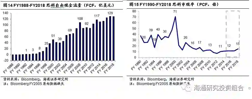 思科原传统硬件业务快速发展期(2001年前),其传统通信设备业务蓬勃发展至巅峰,可以多关注其P/E与P/B指标,并参考PEG法对其进行估值。业务进入平稳发展期(2001-2011年)后,订单充沛、利润稳定增加,P/E、EV/EBIDTA、P/S都有较强的适用性。而在通信设备商到IT服务商转型初期(2011-2015年),可以采用EV/S(或P/S)估值,且由于新业务初期增速较快,也可采用SOTP(分部估值法),对新业务采用PEG估值,对盈利稳定的传统业务采用P/E或EV/EBIDTA估值,多部加总得到公司估值。转型中后期(2015年后),思科转变为软件驱动的供应商,FCF重要性相对增强,可采用FCF方法对其进行估值。
