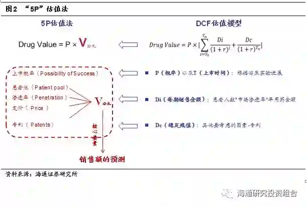 考虑到绝对估法值引入太多的参数且不够直观,不适用于二级市场,我们采用“5P”估值法进行创新药估值。“5P”即上市概率(Possibility of Success)、患者池(Patientpool)、渗透率(Penetration)、定价(Price)和专利(Patents& exclusivity)。其中,上市概率反映药品成功上市的可能性,患者池、渗透率、定价反映产品市场空间,专利反映了产品的生命周期。这5个因素对创新药公司的未来现金流影响重大。