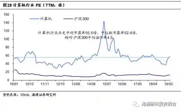 纵向来看,从2010年到2019年4月30日,计算机行业历史平均市盈率(TTM)在55.5倍,中位数在52.4倍;截至2019年4月30日,计算机行业市盈率(TTM)在57.5倍,处于历史平均水平。横向来看,相比沪深300的历史平均12.6倍市盈率(TTM),计算机行业的平均溢价率在4.5倍左右。