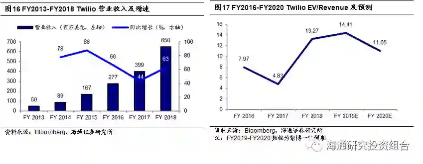 对于Twilio而言,由于公司未实现盈利,但营收增长较快,FY2018营业总收入为6.5亿美元(同比+63%),可以采用EV/Revenue对其进行估值,FY2016-FY2018,公司的EV/Revenue分别为7.97、4.83和13.27。同时,作为CPAAS(通信平台服务)企业,Twilio自身也非常重视反映客户数量、粘性和营收贡献的相关运营指标,如活跃客户账户数、基本收入和基于同组客户收入的净扩张率等。虽然市场因Twilio大客户营收占比较高,而对基本收入指标作为营收稳定性的合理性存在质疑,但综合营收、现金流、客户数据等指标,仍然可以对公司价值进行合理度量。