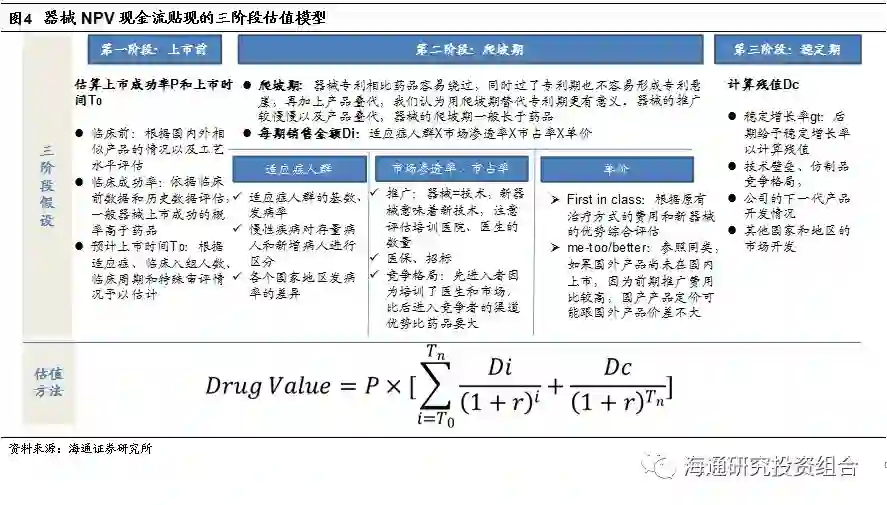 我们认为当前通行的创新器械估值还是NPV现金流折现,基于风险调整现金流折现估值法。与创新药相比,我们认为创新器械的估值有三大不同: