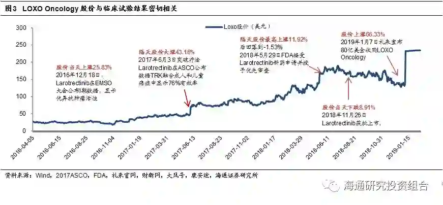 我们认为,创新药品种潜在投资收益最大的阶段是临床阶段,NDA以及获批上市则是“利好兑现”阶段。例如热门生物科技公司Loxo Oncology在2016年12月18日首次披露TRK抑制剂Larotrectinib的I期临床数据,显示优异的抗肿瘤活性,股价当天上涨25.83%。随后2017年6月3号,ASCO会议上Larotrectinib的II期临床数据惊艳亮相,股价再次大涨43.16%。反而到2018年5月29日和2018年11月26日,FDA接受Larotrectinib的NDA申请和获批上市,当天股价均出现下跌。