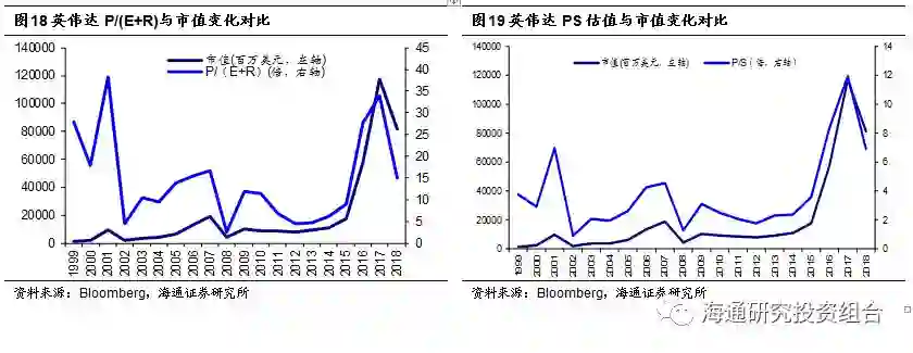 估值方法:IC设计公司将产品制造以及封测环节外包,故公司固定资产以及运营费用较低,但在发展初期以及成长阶段需要保持巨额的研发费用投入。在公司将研发投入转化为收入前,由于研发费用支出较大,公司盈利能力相对较弱,因此可以用PS估值法来反映公司营收先于盈利释放的情况。2014年之前,英伟达的P/S估值系数相对稳定(剔除2000年互联网泡沫阶段)。同时也可以使用P/(E+R)来反映公司的研发投入对未来成长性带来的贡献。