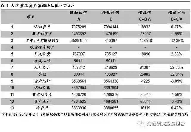 案例分析:中国重工发行股份收购资产。中国重工是我国大型海工及船舰制造企业。2018年2月,公司公告拟通过发行股份的方式收购少数股东持有的大连重工、武船重工股权。根据2018年2月公布的《中国船舶重工股份有限公司发行股份购买资产暨关联交易报告书(修订稿)》,中国重工对大连重工和武船重工的收购都是通过基础法进行定价评估。通过资产基础法,大连重工的资产价值为388亿元,增值率为0.42%,以下为该方案定价过程。