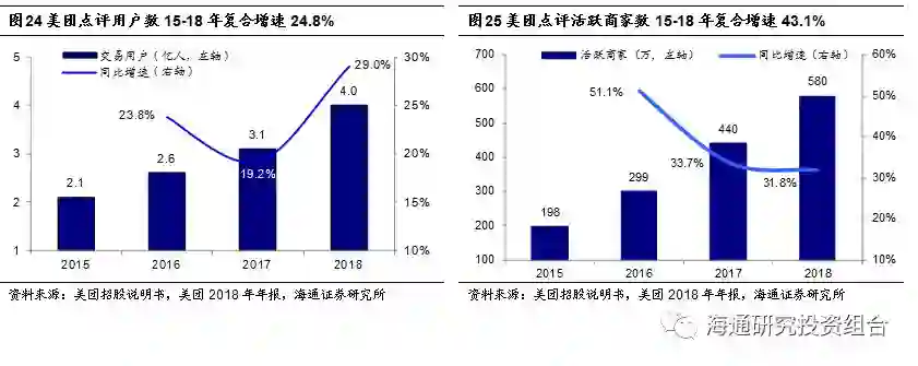 美团进入成长期,用户数由高速增长转入中速增长。美团点评前身美团网成立于2010年,美团点评目前处于成长期,交易用户数由2015年2.1亿增长至2018年的4亿,年复合增速24.8%,活跃商家数由2015年的198万家增长至2018年的580万家,年化复合增速43.1%,用户增长由高速增长转入中速增长。