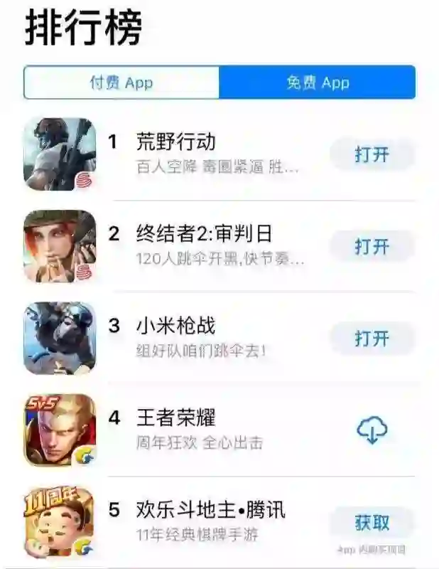 11 月 3 日当天,大厂网易也带着自家的两款「大逃杀」手游《荒野行动》、《终结者 2 :审判日》杀进“战场”,没过多久便改写了 App Store 下载榜排名,形成了 Top 3 :《荒野行动》、《终结者 2 :审判日》、《小米枪战》的新格局,坐在头把交椅持续半年的《王者荣耀》旋即到了第四位,它终于不再是「话题之王」。
