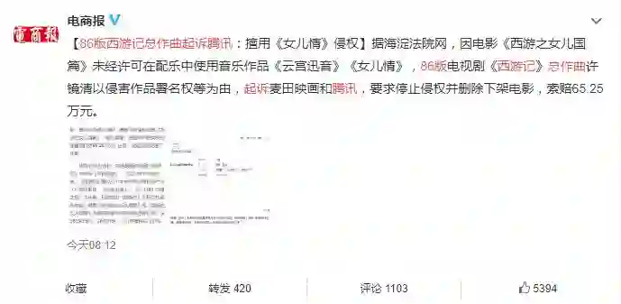 据中国新闻网 86版电视剧《西游记》总作曲许镜清近日以侵害作品署名权、作品信息网络传播权纠纷为由,将北京麦田映画文化传媒有限公司、深圳市腾讯计算机系统有限公司诉至法院。许镜清称,电影《西游之女儿国篇》未经许可在配乐中使用自己的音乐作品《云宫迅音》《女儿情》,请求法院判令对方停止侵权、删除下架侵权电影《西游之女儿国篇》、赔礼道歉、赔偿经济损失及合理费用共计65.25万元。