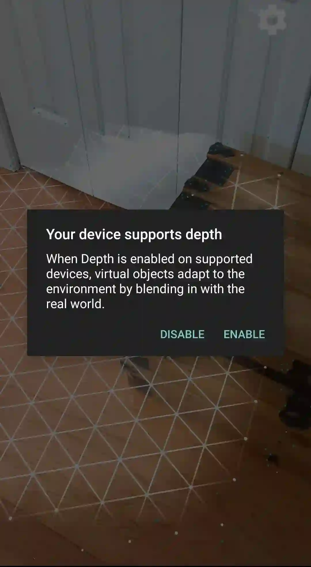 在你首次运行应用或放置 “安卓小人” 时,屏幕上会弹出对话框,提示你启用 Depth。这个对话框只会在首次启用时弹出,点击 Enable (启用),就能实现遮挡功能了。