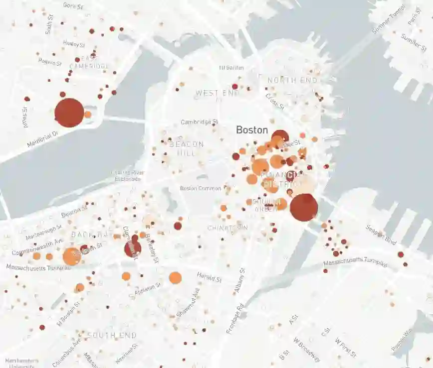 利用这一工具我们可以在一张图上呈现出多个不同维度的信息,就像上图所示的例子,可以利用圆圈的大小来表示数量,颜色来表示范围,位置来描述各个数据源之间的空间趋势。这种图在描述某种变量的分布时十分有用,例如对于某一人群的分布、某些疾病数据的呈现等都十分直观。