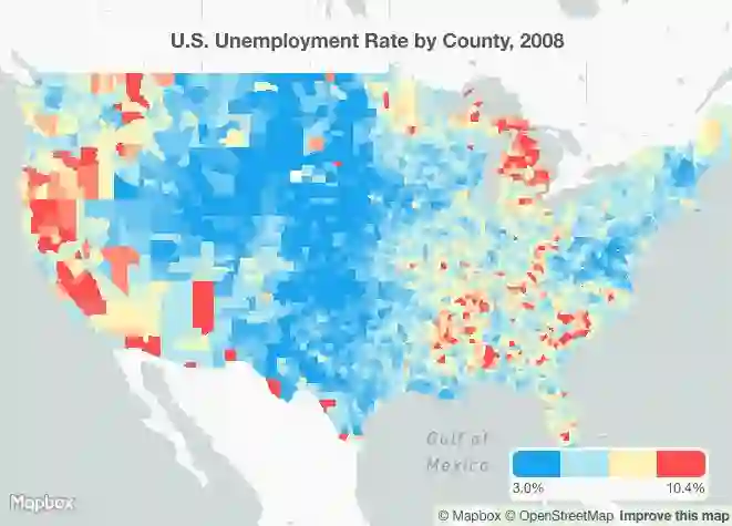 如果你想要呈现基于地域的数据信息,那么choropleth一定是你的不二选择。通过对于不同区域对应的数值着色,可以十分方便的呈现出某一数据在不同地区的数值和差异,上图的例子显示美国的失业率分布。我们可以利用这个工具对不同国家、市镇、乡村、市场区域甚至邮编表示的区域来呈现数据分布。