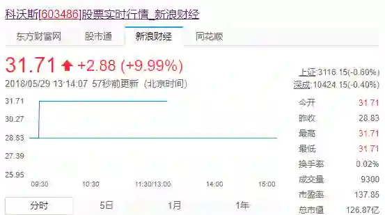 2018年5月28日,科沃斯自去年2月提交第一版招股书后,历时15个月“神速”在A股上市。其股价在开盘不到5分钟就从24.02元升至28.02元,当日收于28.83元。次日,科沃斯[603486]开盘即涨9.99%,报31.71元,而其所属的白色家电行业,开盘跌幅为7.46%。
