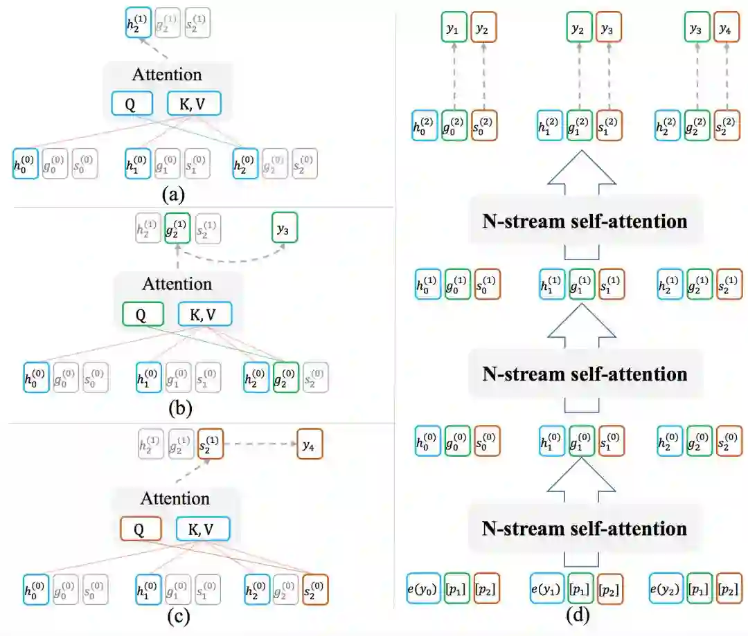 图2:(a) 为main stream self-attention;(b) 为1-st predicting stream self-attention;(c) 为2-nd predicting stream self-attention;(d) 展示了n-stream self-attention的输入输出及流程。