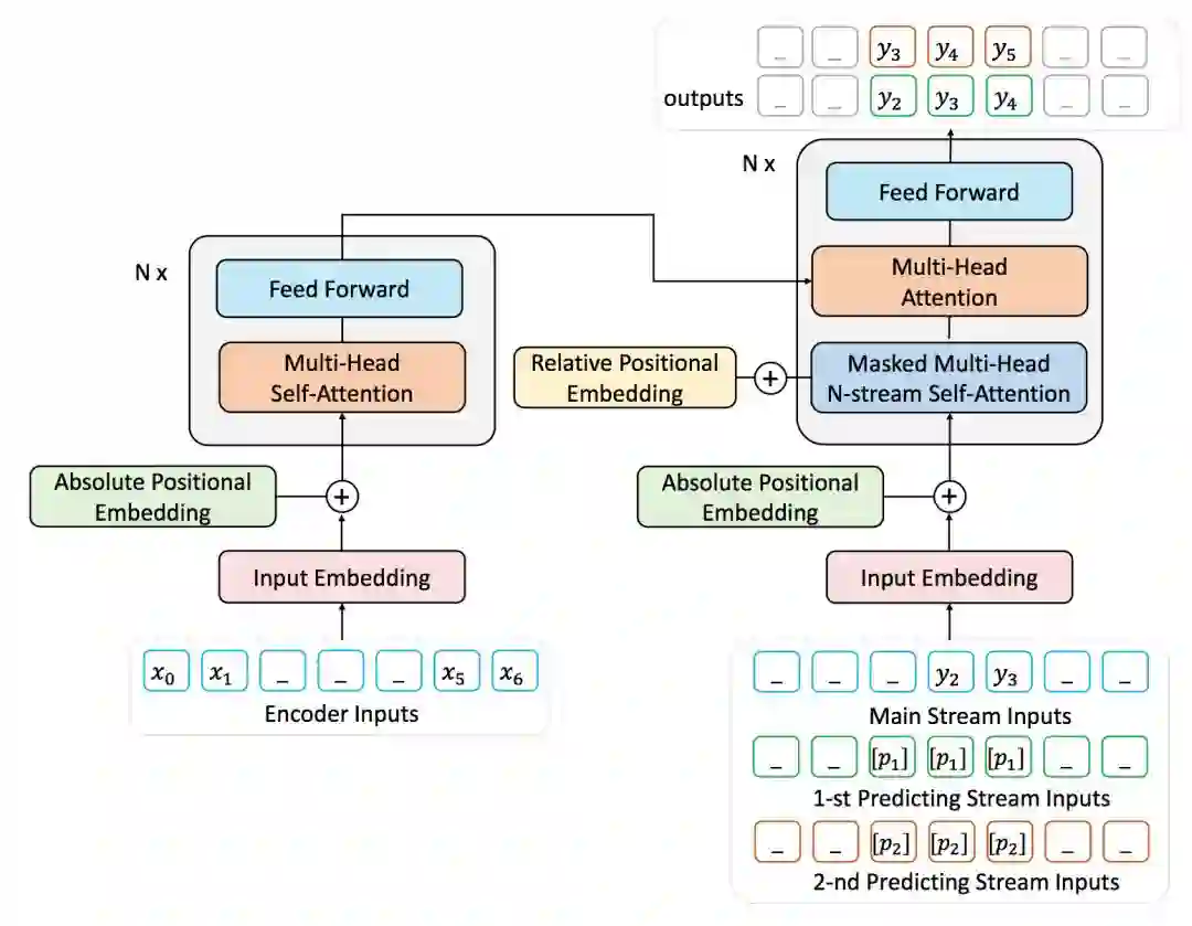 由于难以获取到大量带标记的序列对数据,我们用去噪的自编码任务通过大量无标记文本预训练 ProphetNet。去噪的自编码任务旨在输入被噪音函数破坏后的序列,让模型学习去复原原始序列。该任务被广泛应于 seq2seq 模型的预训练中,如 MASS、BART、T5 等。本文中使用 MASS 的预训练方式,通过引入提出的 predicting n-stream 自监督学习目标函数预训练 ProphetNet。我们以 bigram 形式的 ProphetNet 为例,整个流程如图3所示: